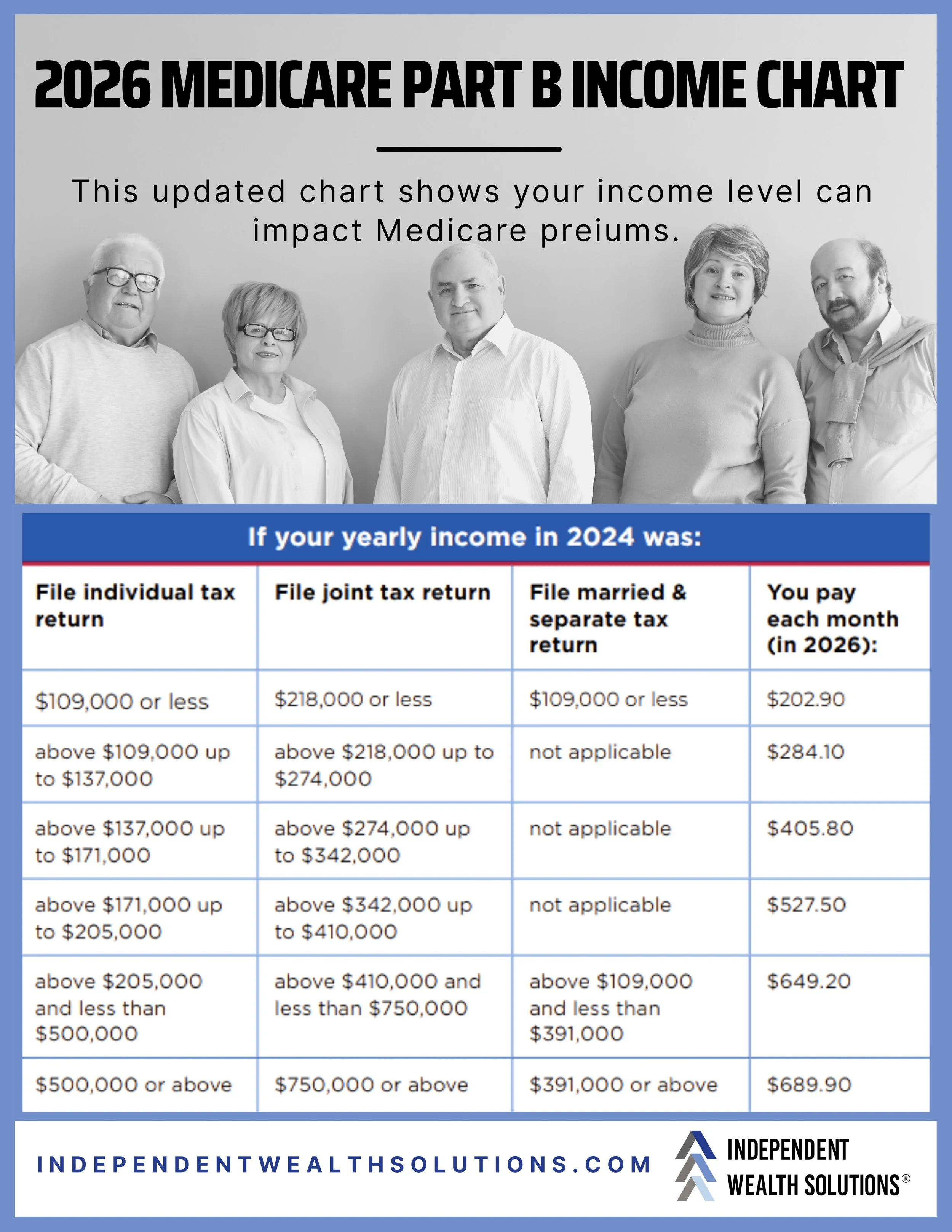 According to the 2026 Medicare Part B income chart, your monthly premium is based on your 2024 tax return (this is because of the Look-Back Rule: Medicare uses a "prior-prior-year" tax rule, meaning 2024 income determines 2026 premiums). If your income exceeds certain thresholds, you may pay an Income-Related Monthly Adjustment Amount, often referred to as IRMAA, in addition to your standard plan premium.